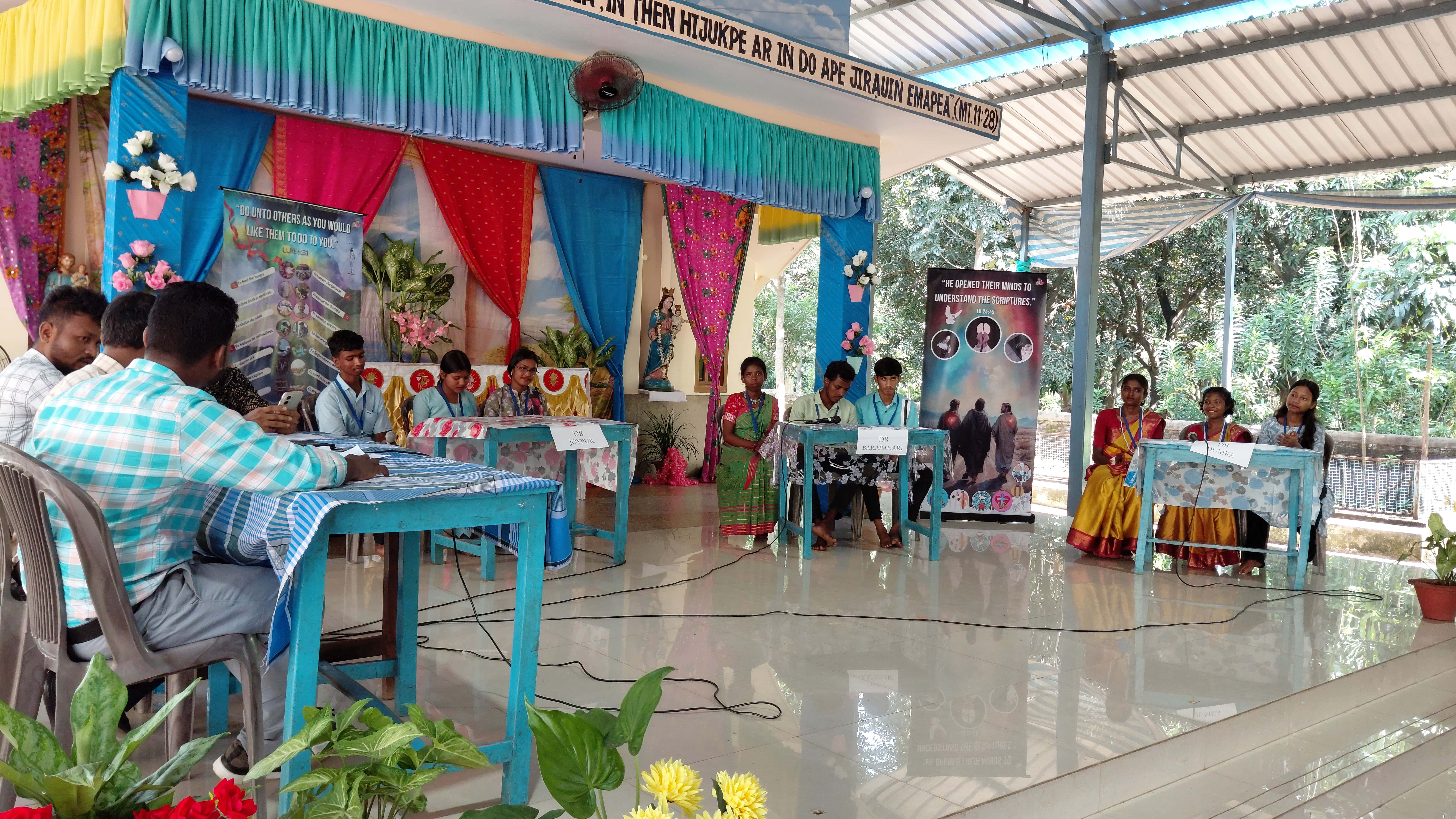 At 9:30 AM, the Blessed Sacrament was exposed, allowing participants to spend time in prayer and worship, led by Deacon Bernard Mardi. This was followed by the Eucharistic celebration at 11:00 AM, presided over by Rev. Fr. Joseph Pauria, the Provincial of the Salesian Province of Kolkata. He was accompanied by Rev. Fr. Shanti Soren, Fr. Karlus Murmu, Fr. Peter Munna, and Fr. Kumudo Digal as concelebrants, along with two deacons present for the celebration. The choir, composed of the youth from Barapahari parish, filled the liturgy with melodious singing, encouraging everyone's devotional participation. In his homily, Fr. Joseph Pauria urged all present to be missionary disciples, bearing witness to Christ through their daily words, gestures, actions, and attitudes. After Mass and a short break, the participants gathered for the Mega Catholic Catechism Quiz, featuring three finalists from each parish.